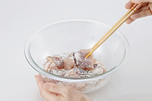 薄力粉やかたくり粉で肉や魚介類が固くなることを防ぐ