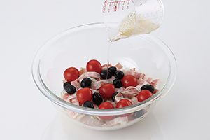 耐熱ガラス製ボウルに肉、魚介類を入れ、全体に薄力粉/かたくり粉をまぶす。
