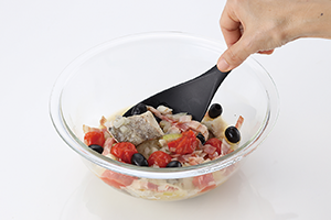 加熱後、ソースがからむように底から軽く混ぜ合わせる。